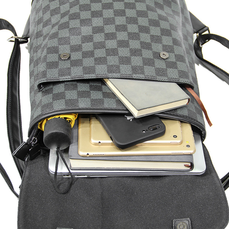 Checkered men casual business large capacity backpack oxford Pu leather bag